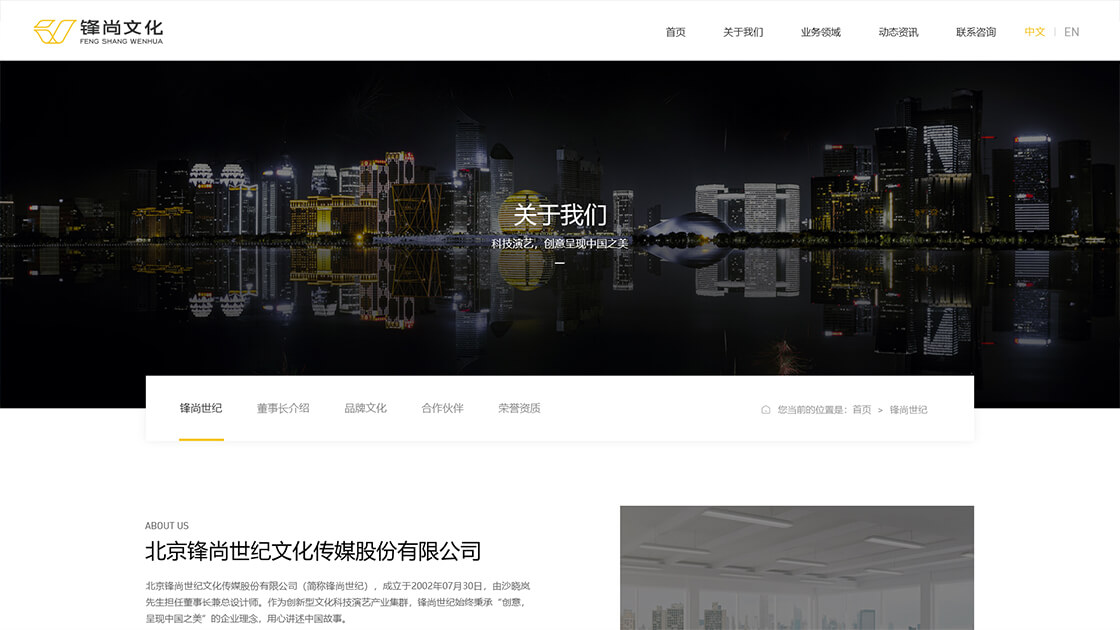 北京锋尚世纪文化传媒股份有限公司(简称锋尚文化,股票代码:300860),成立于2002年07月30日,由沙晓岚先生担任董事长兼总设计师。作为创新型文化科技演艺产业集群,锋尚文化始终秉承“创意,呈现中国之美”的企业理念,用心讲述中国故事。